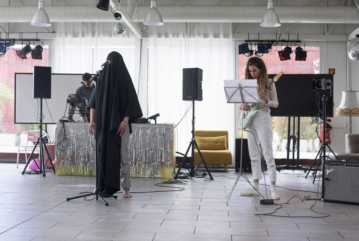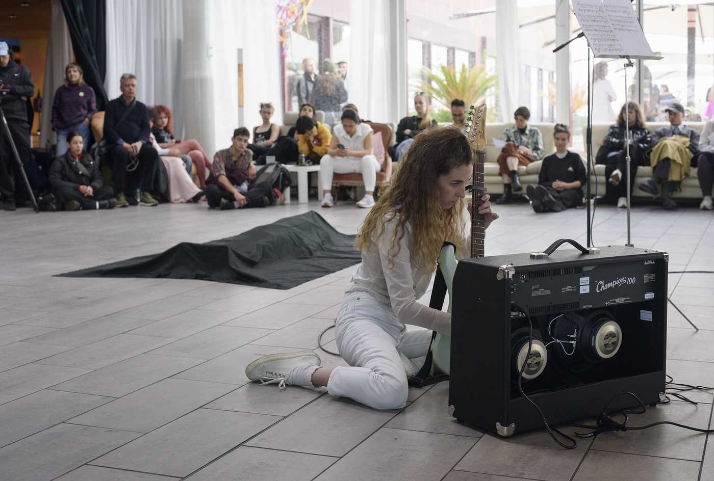 During the performance, my voice chants the call to prayer, before I engage in the breath practice of the Zikr, drawing from Sufi tradition. Through the repetitive motion, shaping the black sheet, and the electric guitar’s clusters, there’s a tangible suffocative effect. The rearrangement of John Dowland’s Renaissance composition for electric guitar introduces a profound pathos, reigniting a sens of poetic-revolutionary fervor. In confronting the oppressive realities, the plea « Let me mourn » seeks acknowledgment, urging to grasp the material reality of these struggles.